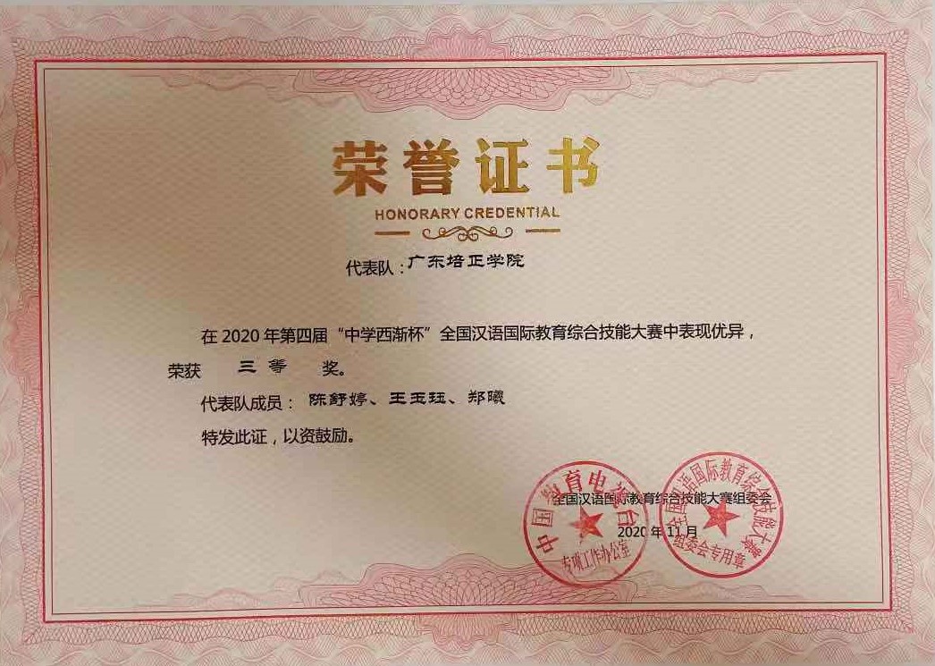 本网讯(人文学院 朱楚灵)12月1日,第四届“中学西渐杯”全国汉语国际教育综合技能大赛完美收官,我校陈舒婷、王玉珏、郑曦、陈金月四名同学,在本次大赛中荣获团体三等奖。同时,我校杨凌老师、方峥炜老师荣获“优秀指导老师”荣誉称号。