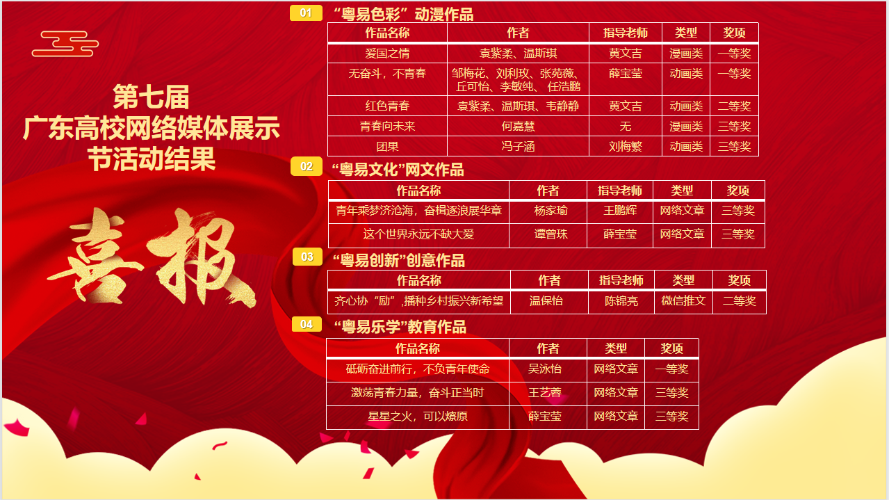 根据《广东省教育厅关于举办第七届广东高校网络媒体展示节的通知》精神,我省各高校组织师生围绕“奋斗者·正青春”主题,精心设计,积极创作,涌现出一批优秀原创网络文化作品。经组织专家评审,“粤易光影”视觉作品展示活动、“粤易色彩”动漫作品展示活动、“粤易文化”网文作品展示活动、“粤易创新"创意作品展示活动、“粤易乐学”教育作品展示活动等5个项目各评出一等奖20项、二等奖30项、三等奖50项。其中我校共11项作品获奖,一等奖3项,二等奖2项,三等奖6项!