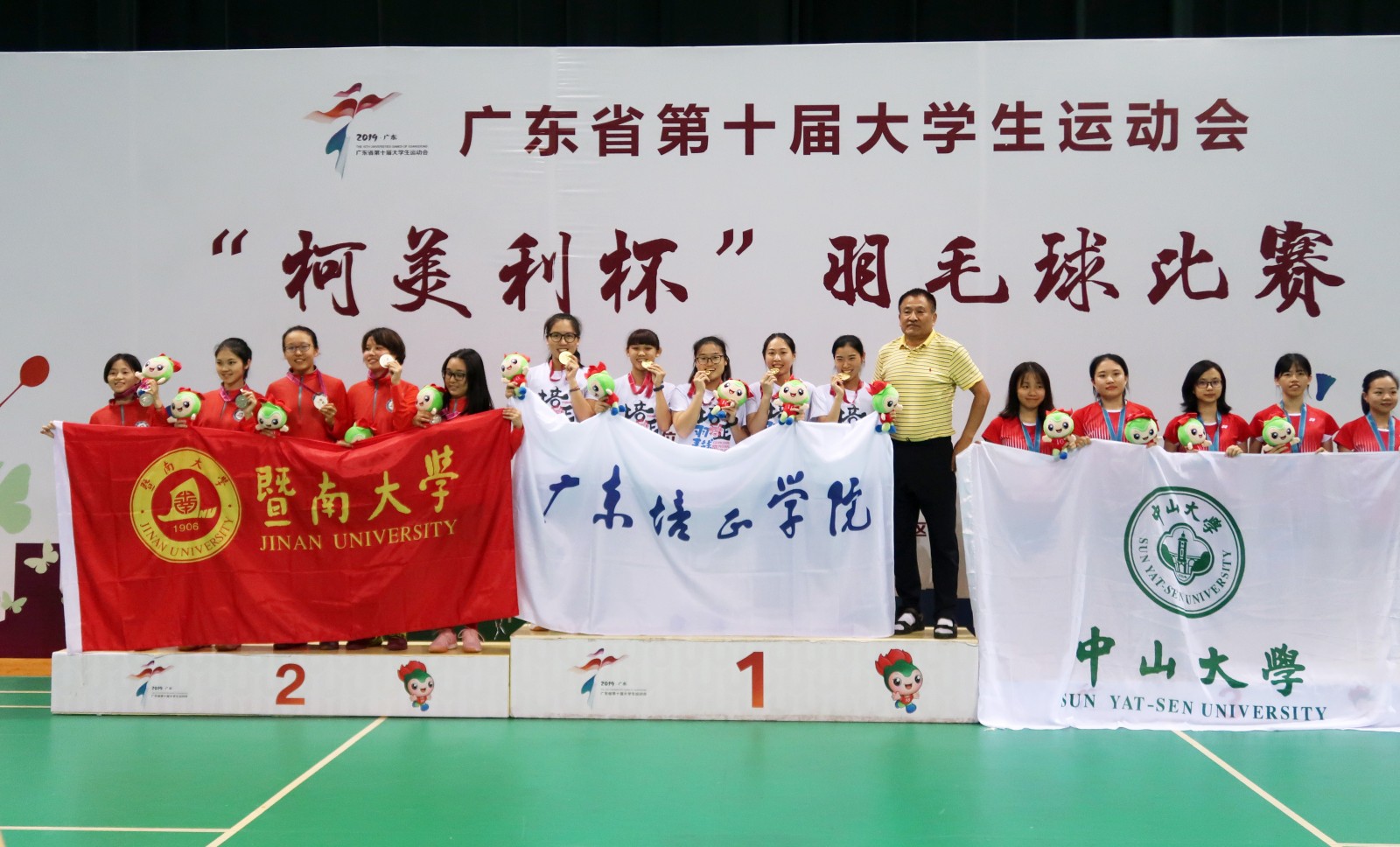本网讯(体育学院 黄士)5月27日,我校获得广东省第十届大学生运动会羽毛球甲组女子团体赛冠军,标志着本届运动会培正首金的正式诞生。队员许思欣、袁朱佳钰、鄞安子、陈紫欣、林汇,教练员陈春平、林挺、杨秀华为学校赢得了这场荣誉之战。