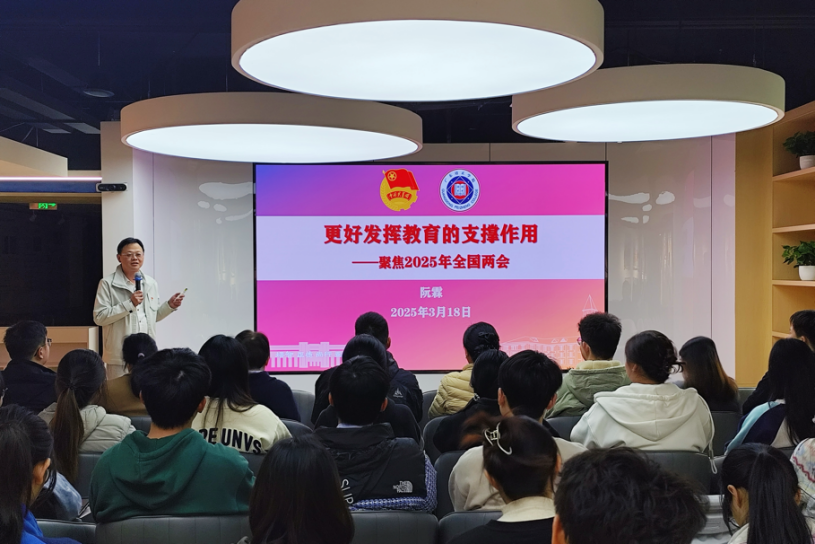 阮霖同志以“更好发挥教育的支撑作用——聚焦2025年全国两会”为题,从“教育的支撑作用”、“教育的首要问题”和“青年力量”三个方面,为大家讲述“做报国强国,挺膺担当的新时代青年”的重要意义与方法路径。他讲到,要聚焦于习近平总书记在全国政协十四届三次会议上的重要讲话,深入解读教育在新时代新征程中的重要支撑作用,建设教育强国、科技强国、人才强国,必须坚持正确办学方向,培养德智体美劳全面发展的社会主义建设者和接班人,他强调,推进中国式现代化,科技是关键,人才是基础,教育是根本。