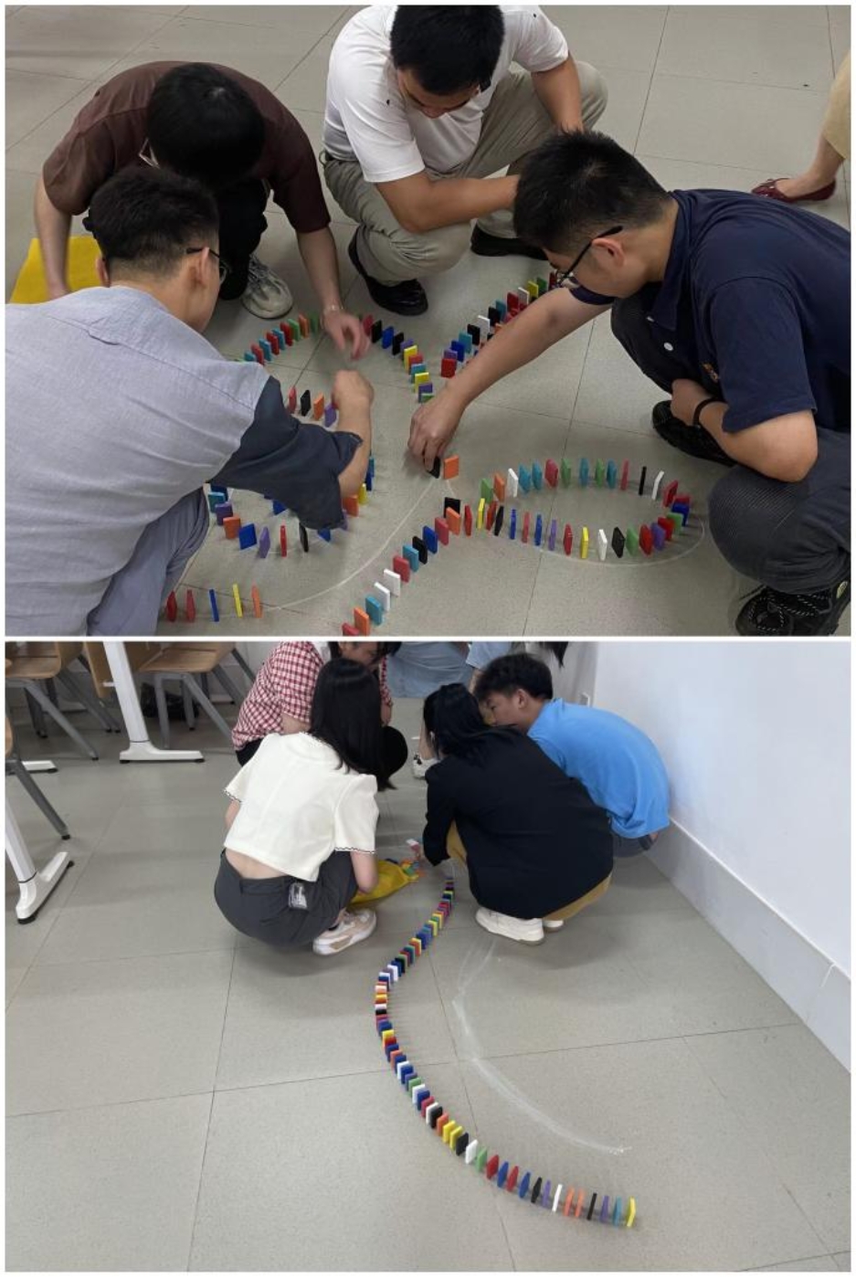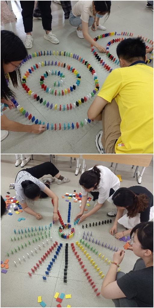 多米诺骨牌比拼活动,按照一定数量的人员分组,每组发放一套多米诺骨牌,各组根据自己的协商的意见去完成造型排列拼接,要求尽可能把骨牌都用完,并且骨牌绊倒能够做到一气呵成。参赛人员围绕国家、党史、校史以及学院师生等主题开展多米诺骨牌拼排。