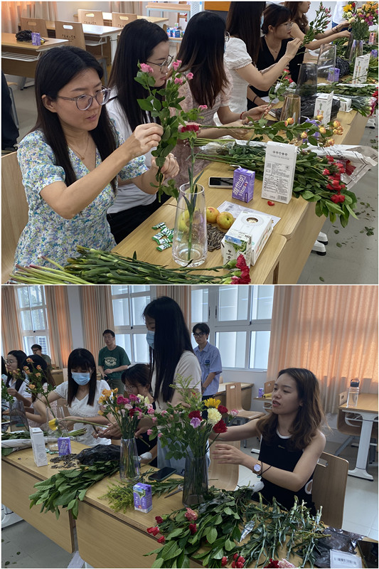 本次插画活动提前准备好一些鲜花以及裁剪工具,现场提供部分样板给大家参考制作,在座的学工老师个个都心灵手巧并化身高级插花师,他们都完成了一份份满意的作品。