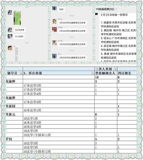 配合校办做好全校在籍学生在湖北、温州情况摸底问卷调查。严格落实学生健康信息“日报告”制度,采取辅导员“人盯人”措施,每天准确掌握未返校学生所在地信息、健康信息及行踪信息等情况,形成“一天一报”工作常态化。动态记载学生所在位置和健康状况,确保异常情况及时反馈、特殊情况密切跟踪。配合教务处做好对在校外实习毕业生的摸查工作,做好毕业生有关疫情防控的相关工作。