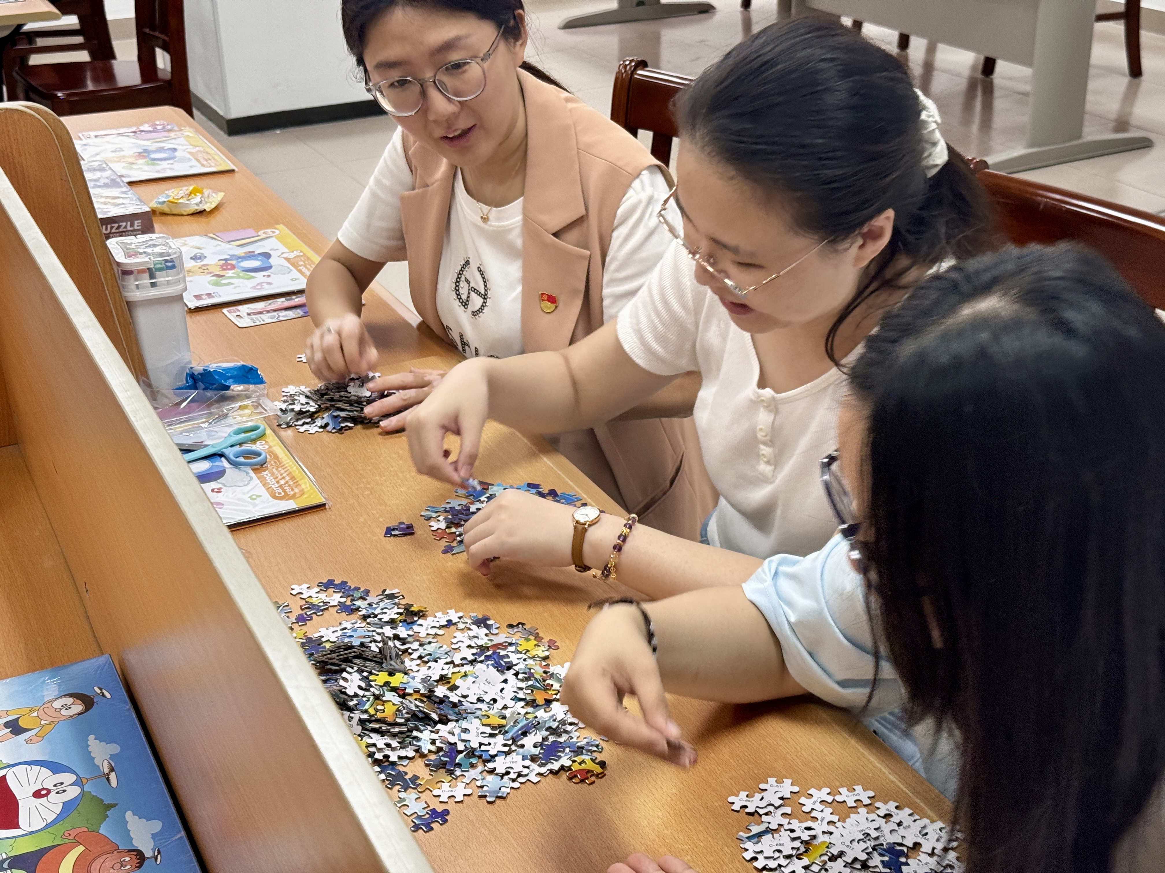 拼图活动是本次沙龙的一大亮点。辅导员们分成小组,全身心投入到拼图挑战中。这不仅考验了他们的体力、耐力和意志力,更培养了智力、想象力和创造力。在拼图过程中,大家相互协作,共同攻克难关,充分展现了团队合作的力量。