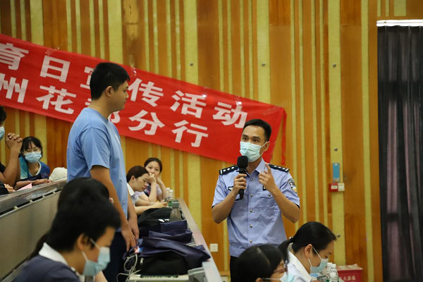 活动第二项由广州市花都区公安分局刑警大队反诈中心冯道豪队长和吴锦坚警官开展防范电信网络诈骗宣讲。吴警官通报了今年目前为止花都区高校诈骗案件的形势,并通过观看防诈骗短视频重点揭露目前高校高发的电信诈骗常见和新型诈骗伎俩。冯队长通过与学生现场提问答疑的互动形式,提醒同学们应当不断提高自己的自制力和防范诈骗的意识,切莫在贪婪欲望的驱使下被诈骗犯罪分子有机可乘或者触碰了法律的底线,并要求本次参加本次防诈宣传活动的同学们要积极主动的在班级里面开展防诈骗宣传教育活动,班级同学遇到被诈骗事情要及时报告老师或寻求警方帮忙处理。希望同学们为了个人的成长,为了家庭的幸福,为了社会的稳定,务必防范在先,警惕在前,共筑思想、行为和生命的安全长城。