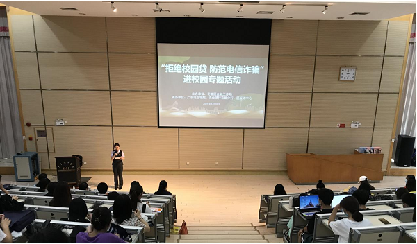 活动第一项由农业银行广州花都分行个人金融部谭丽玲经理为同学们开展“拒绝校园贷、防范电信诈骗”主题讲座。谭经理就目前高校大学生个人金融相关最新政策和常见的诈骗类型进行详细剖析,通过现场提问互动形式重点揭露校园贷和电信诈骗常见和型诈骗伎俩,结合高校实际如何识别校园贷、电信网络诈骗,上当后的补救措施。提醒同学们要切记防诈骗六部曲:不信、不理、不汇款、警惕、试探、速报警。