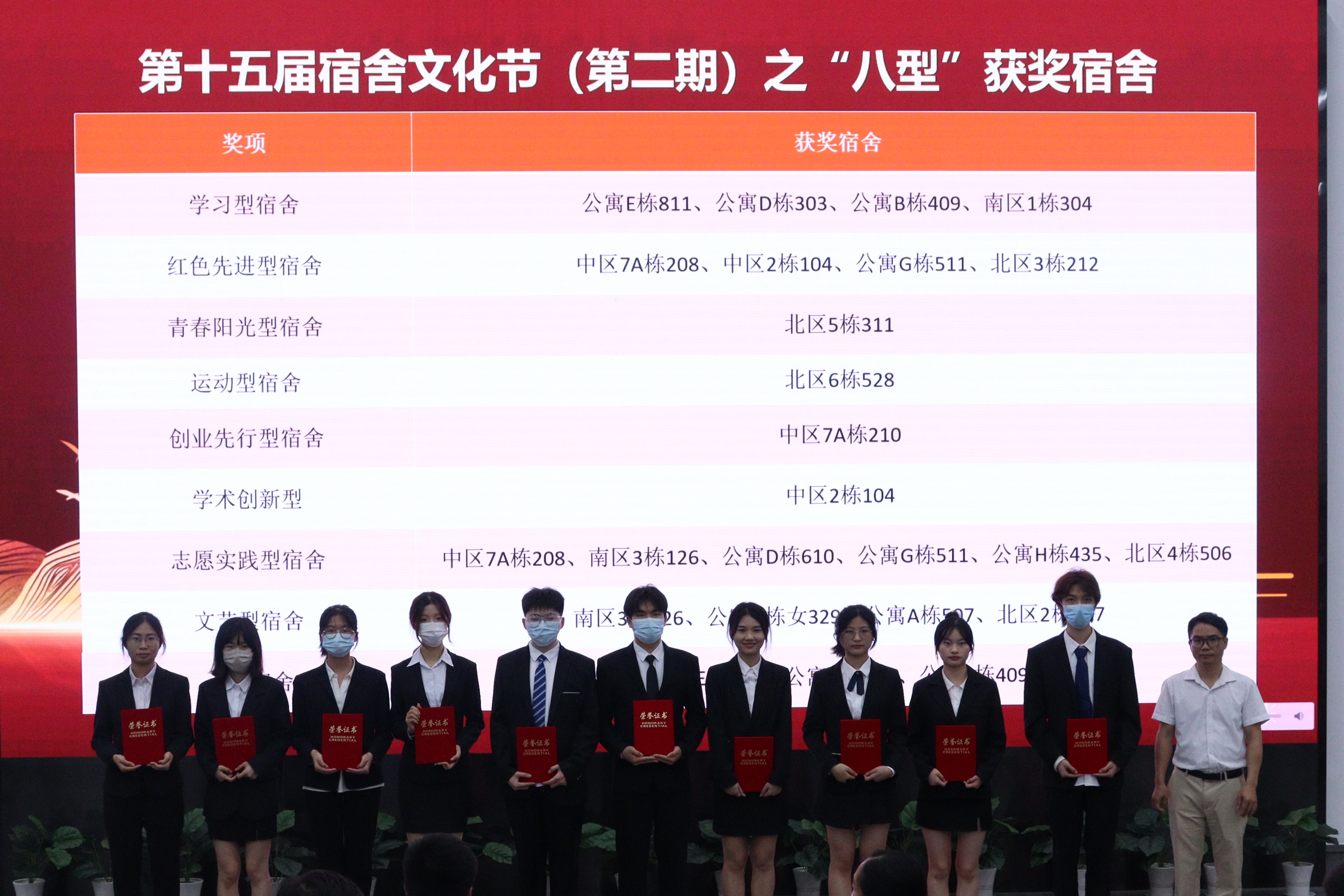 本届宿舍文化节以“奋楫献礼党的二十大,携手共描绿室园”、“薪火相传党的二十大,砥砺深耕五谷繁”为主题,成功开展了“青春献礼党的二十大,绿色寝室共征程”、奋楫献礼党的二十大,绿室踔厉向未来”、“奋楫献礼党的二十大,携手共描绿室园”、怀瑾握瑜摄节俭行,奋楫笃行现光盘美”、“盘中之餐来之不易,爱粮节粮你我共行”等内容,共计14个活动项目,共有1796间宿舍报名参加,参与同学达8500余人。在活动中,学校对在本届文化节取得优异成绩的个人、集体颁发了表彰证书,并进行了现场颁奖。他们的出色表现和突出贡献,得到了全场观众的热烈掌声。