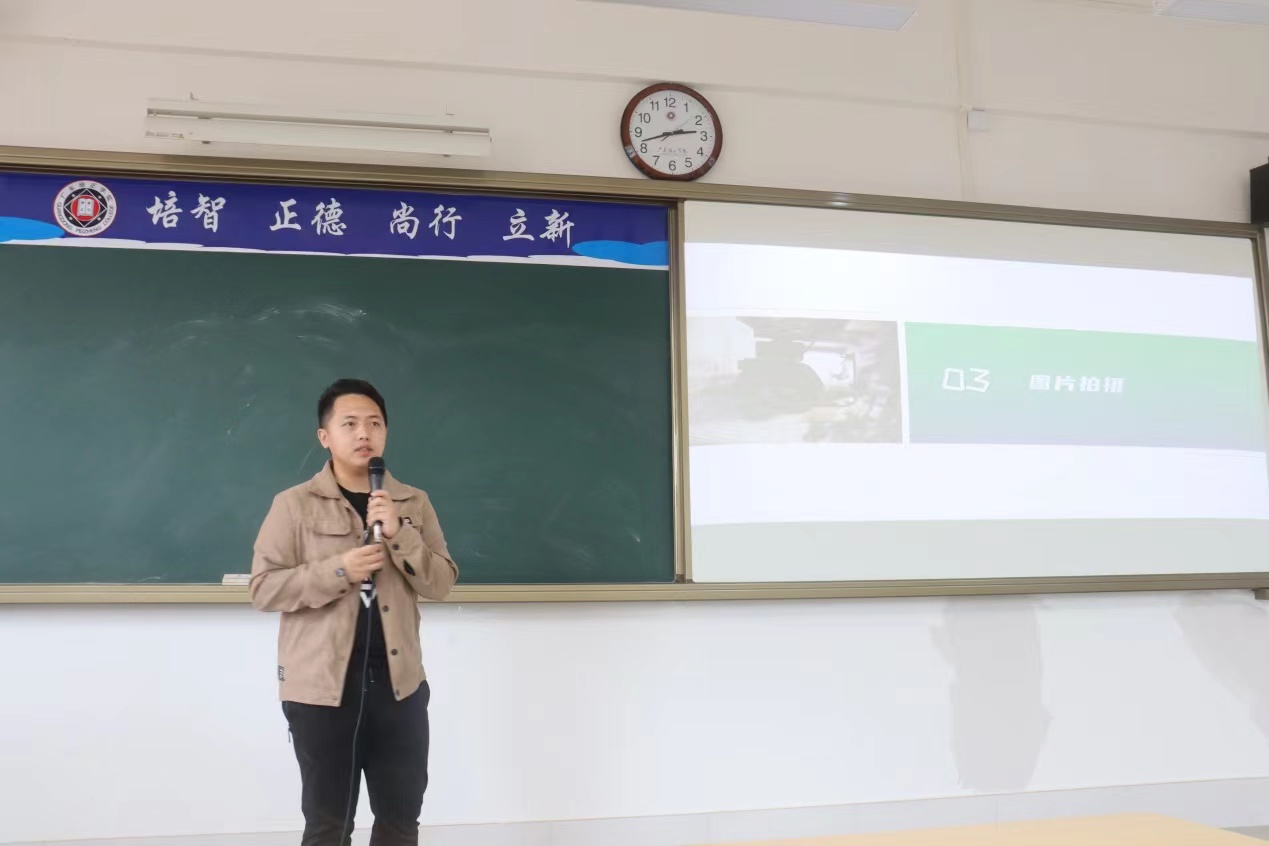 对于摄影培训,叶梓龙老师通过摄影构图、单反操作和实操训练三方面进行培训。"要拍出好看的照片,首先构图很重要,要明确照片突出的主题;其次就是拍摄照片光线的重要性等",摄影构图分为点构图、线构图和面构图,了解了拍摄的理论知识后,叶梓龙老师通过视频为我们讲解了各个构图的区别与操作方法。接着他为我们介绍了有关单反相机的操作,“光圈、曝光补偿、焦距……”这些陌生的名词,在叶老师有条不紊的讲解下逐渐明了,成员们也对摄影技术有了初步的认识。