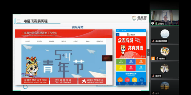 接下来,广东省各高校易班工作代表就“基于易班平台开展网络思政教育工作的思路与方法”、“互联网思维下的易班平台建设”、“构建与学生工作深度融合的易班发展体系”、“构建与学生工作深度融合的易班发展体系”、“校级和二级学院易班工作站建设思路分享”、“探索网络思政,打造线上服务”等主题进行了易班建设经验分享;从优课管理、班级建设、学生党建、校级易班平台的使用与管理、辅导员公共号后台使用与管理、轻应用开发等方面,对易班平台有关功能及运用进行了讲解。期间,参训人员还通过直播的方式参观了省易班中心