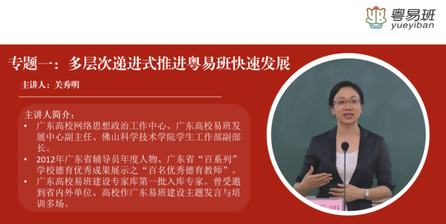 培训开始,广东高校易班发展中心副主任、佛山科学技术学院学生工作部副部长关秀明做了《多层次递进式推进粤易班快速发展》的专题报告。关副处长详细介绍了易班发展历程、广东省易班发展历程以及建设成效和发展愿景;通过“五个依托”、“四种服务”、“三类考核”、“两样激励”、“一个中心”来阐述了粤易班建设的发展思路。