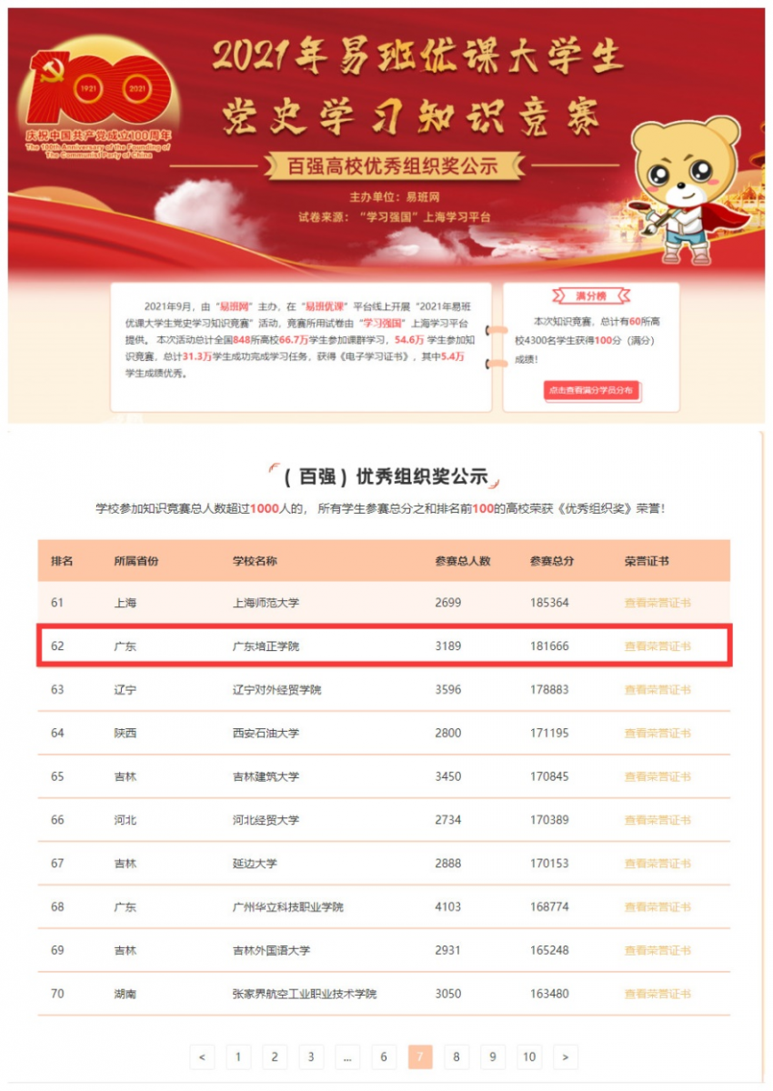 2021年9月,由“易班网”主办,在“易班优课”平台线上开展“2021年易班优课大学生党史学习知识竞赛”活动,竞赛所用试卷由“学习强国”上海学习平台提供。 本次活动总计全国848所高校66.7万学生参加课群学习,54.6万 学生参加知识竞赛,总计31.3万学生成功完成学习任务,获得《电子学习证书》,其中5.4万 学生成绩优秀。